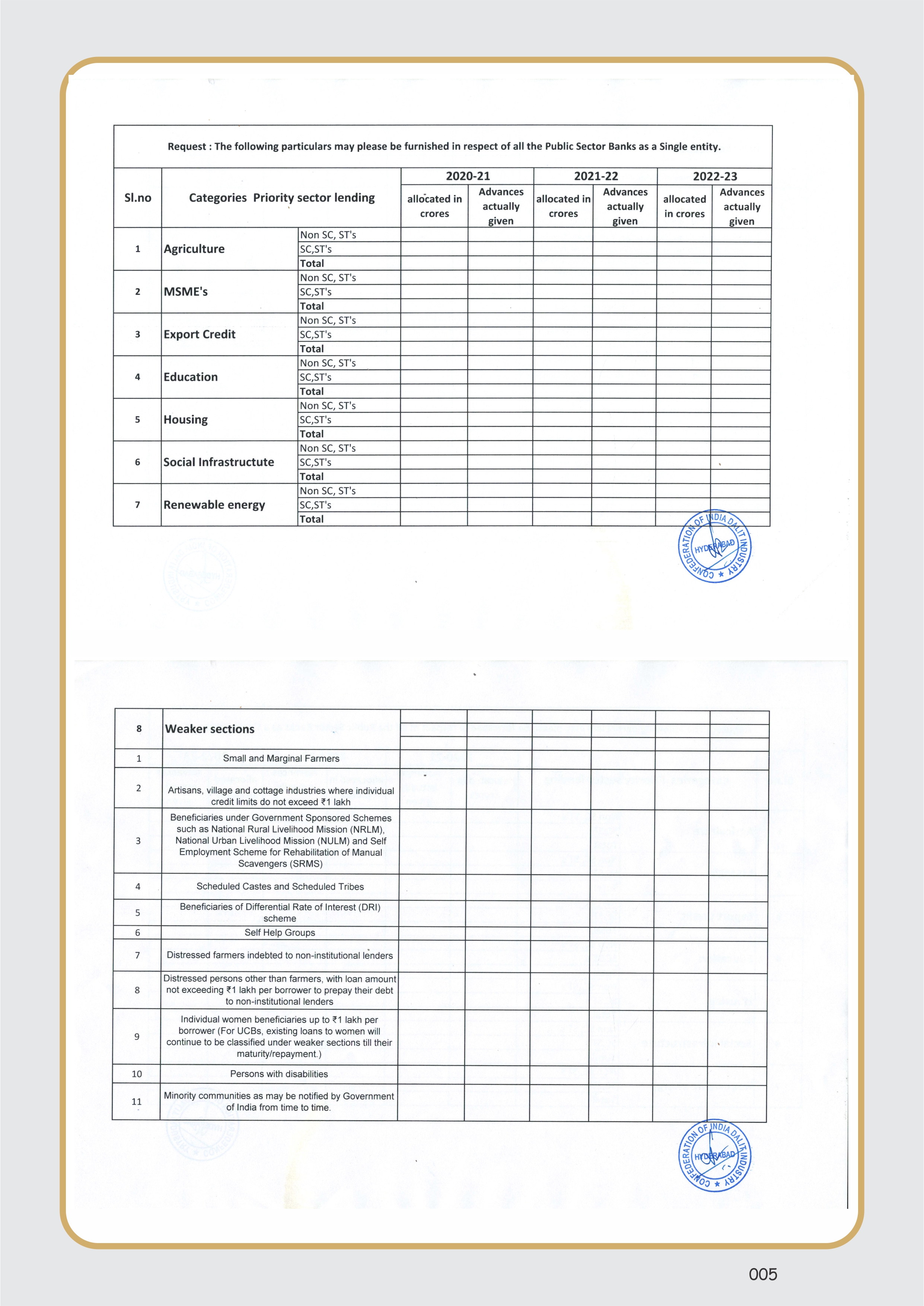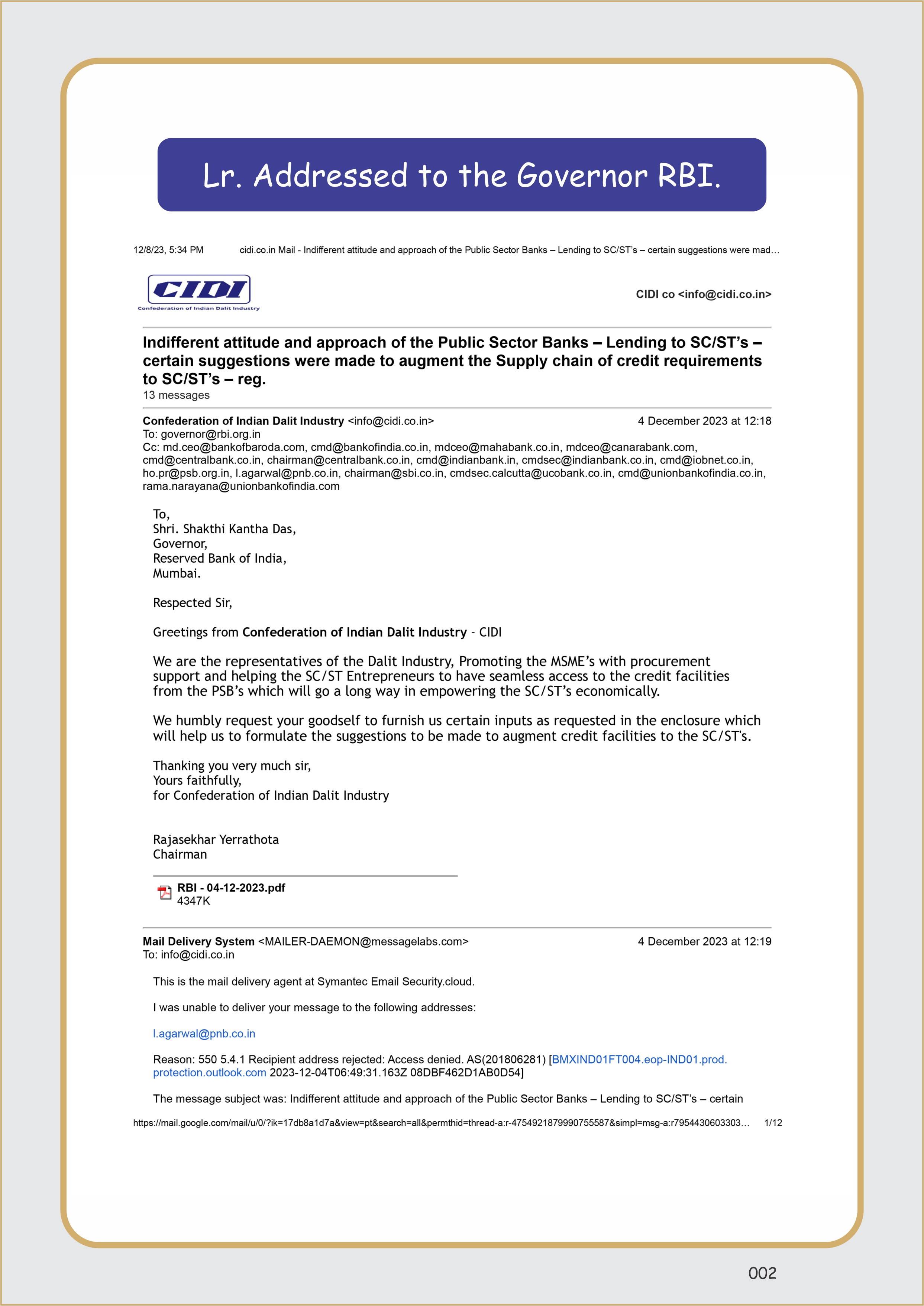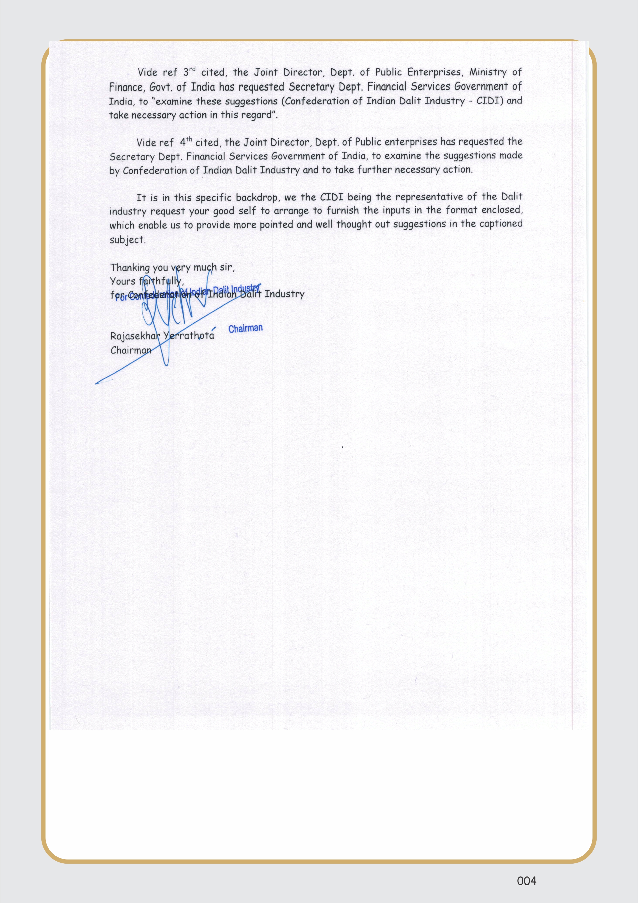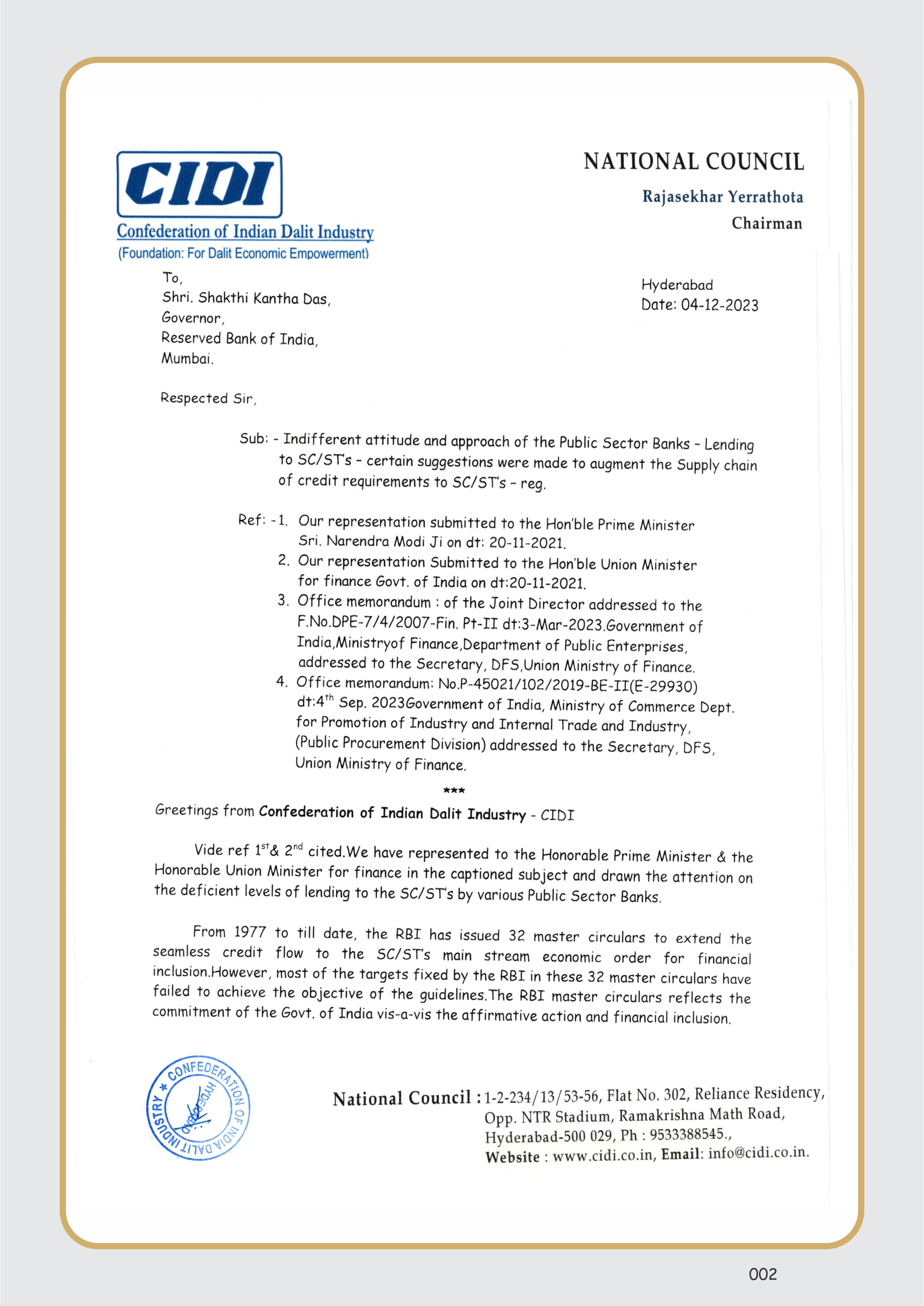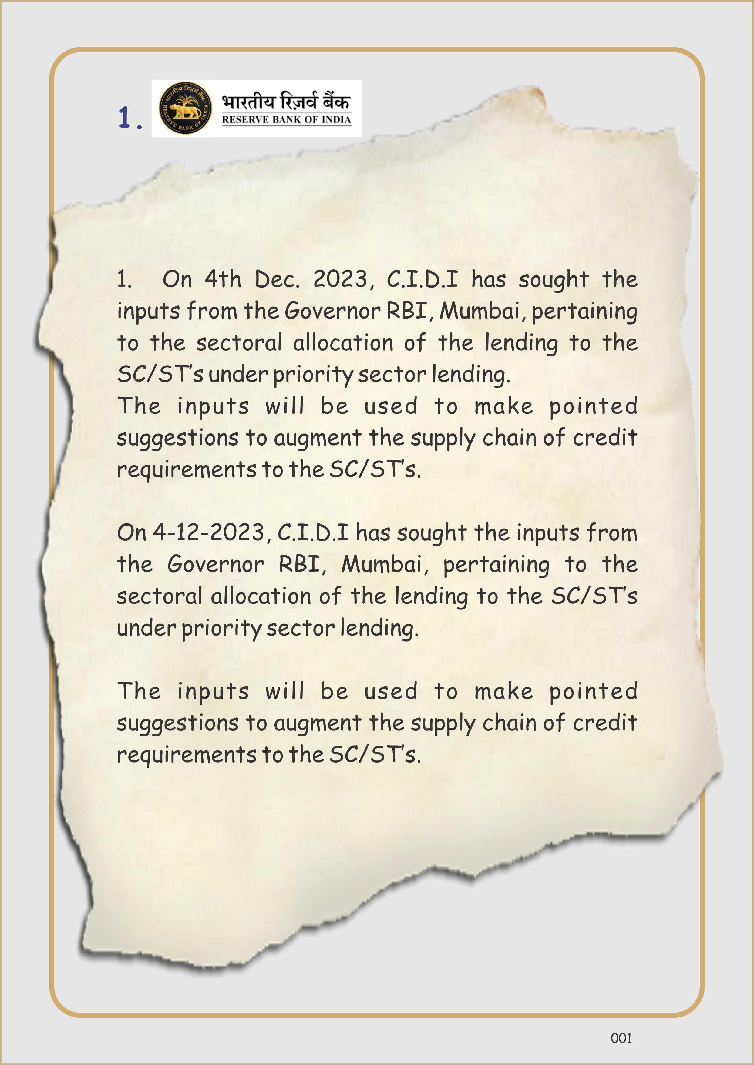 - On 4th Dec. 2023, C.I.D.I has sought the inputs from the Governor RBI, Mumbai, pertaining to the sectoral allocation of the lending to the SC/ST’s under priority sector lending.The inputs will be used to make pointed suggestions to augment the supply chain of credit requirements to the SC/ST’s.