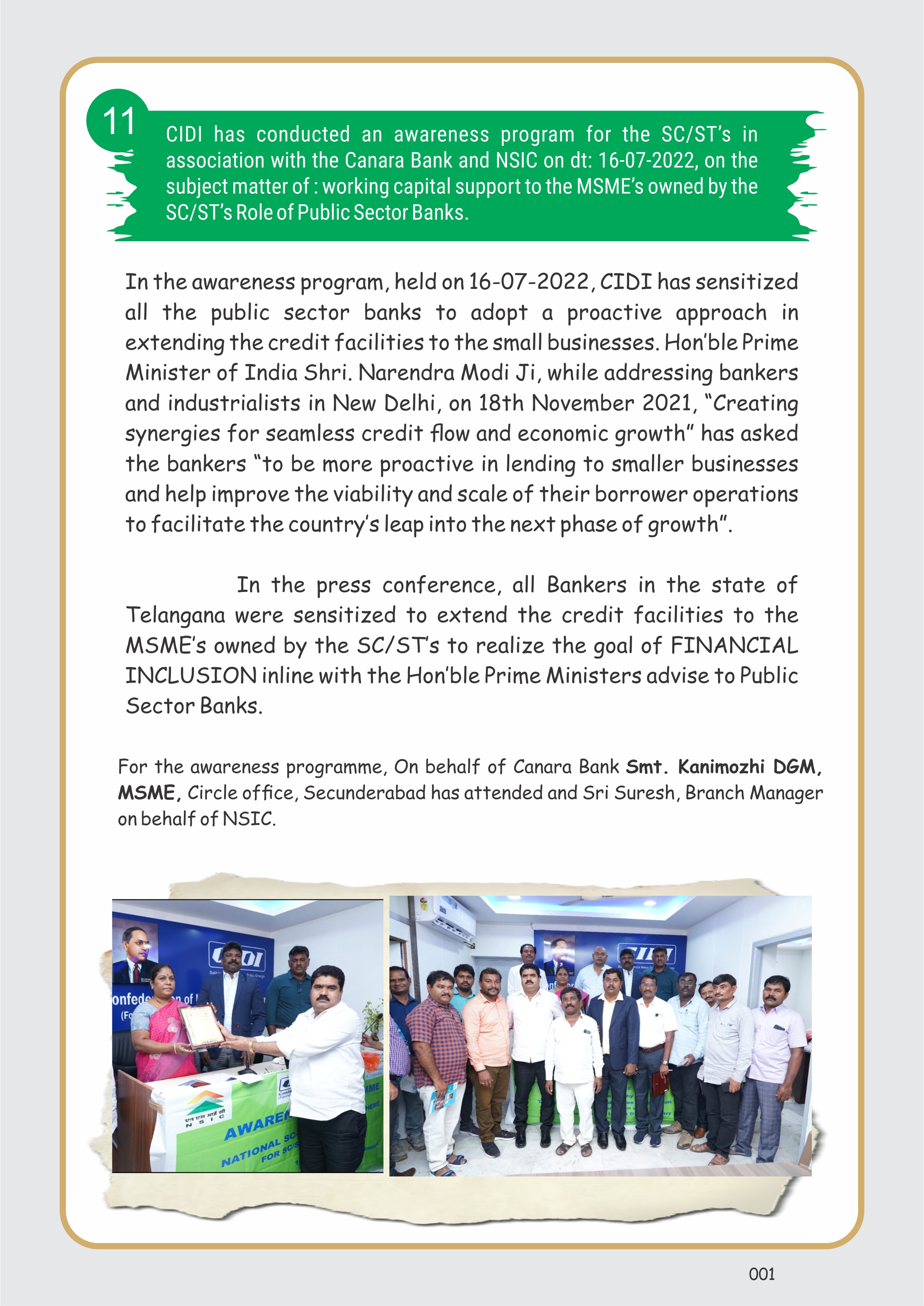 CIDI has conducted an awareness program for the SC/ST’s in association with the Canara Bank and NSIC on 16-07-2022, on the subject matter of : working capital support to the MSME’s owned by the SC/ST’s Role of Public Sector Banks.