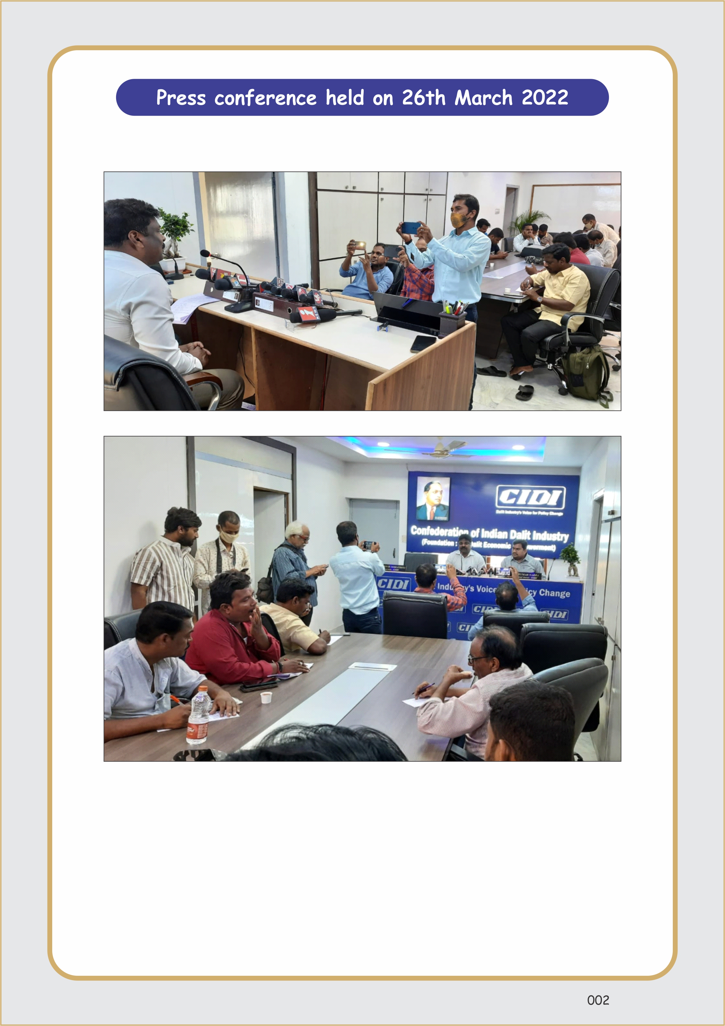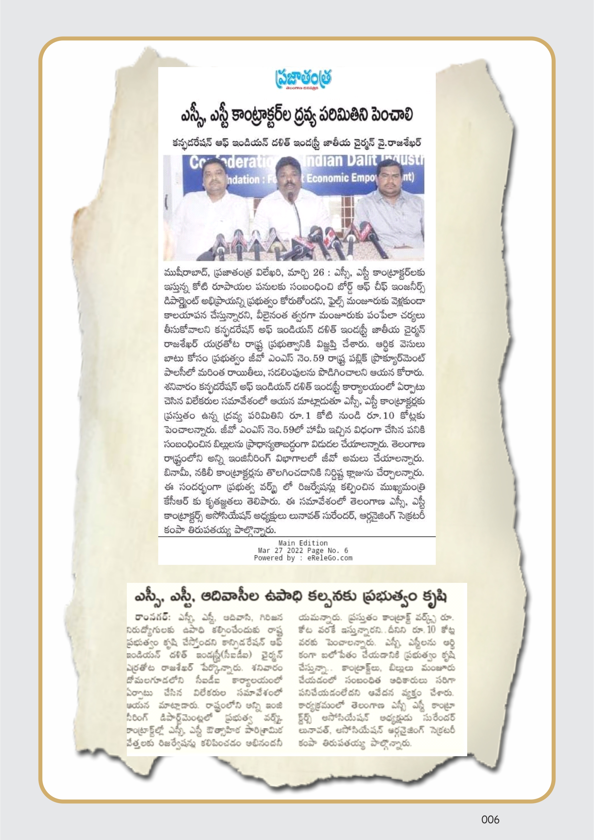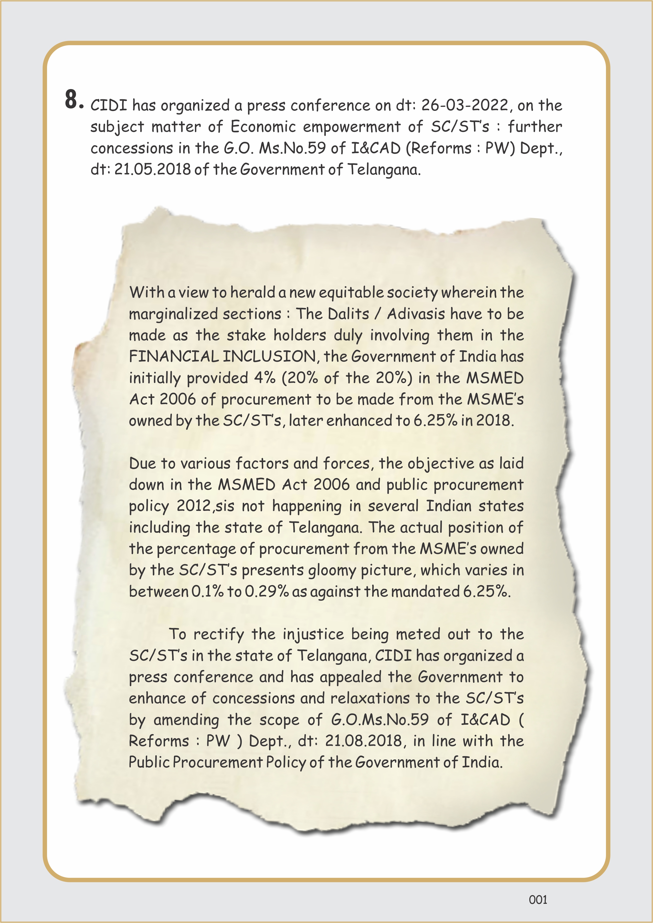 CIDI has organized a press conference on 26-03-2022, on the subject matter of Economic empowerment of SC/ST’s : further concessions in the G.O.Ms.No.59 of I&CAD (Reforms : PW) Dept., dt: 21.05.2018 of the Government of Telangana.